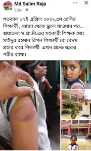গতকাল মঙ্গলবার সকালে বিদ্যালয়ে এক ছাত্রের অভিযোগের ভিত্তিতে শিবচর পৌর এলাকার গুয়াতলা সরকারী প্রাথমিক বিদ্যালয়ের এ ঘটনা ঘটে। আহত শিক্ষার্থী হানিফ এর শরীরে জ্বর ও শরীরে প্রচন্ড ব্যাথা দেখা দিয়েছে। বিষয়টি এখন সামাজিক যোগাযোগ মাধ্যম (ফেইসবুকে) আলোড়ন সৃষ্টি করেছে।