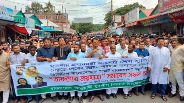 শিবচর প্রতিনিধি: বঙ্গবন্ধু কন্যা মাননীয় প্রধানমন্ত্রী শেখ হাসিনার নেতৃত্বে দেশের উন্নয়ন-অগ্রযাত্রা অব্যাহত রাখতে ও ডিজিটাল বাংলাদেশকে স্মার্ট বাংলাদেশে উন্নীতকরণে শিবচর উপজেলা আওয়ামী যুবলীগের উদ্যোগে তারুণ্যের জয়যাত্রা সমাবেশ অনুষ্ঠিত হয়েছে। শনিবার (২২ জুলাই) সকালে সমাবেশের শোভাযাত্রা উপজেলা আওয়ামী লীগ কার্যালয় থেকে শুরু হয়ে সড়ক ৭১ হয়ে বিজয় চত্বর পর্যন্ত প্রদক্ষিণ করে। পরে সেখানে এক সংক্ষিপ্ত সমাবেশ