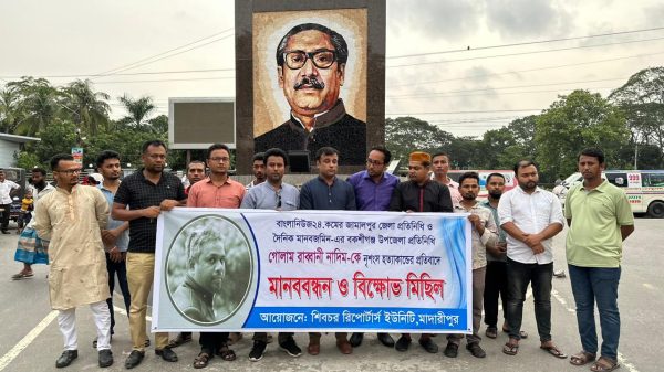 শিবচর (মাদারীপুর) প্রতিনিধি: বাংলানিউজটোয়েন্টিফোর.কমের জামালপুর ডিস্ট্রিক্ট করেসপন্ডেন্ট গোলাম রাব্বানী নাদিমের নৃশংস হত্যাকাণ্ডের ঘটনায় তীব্র নিন্দা জানিয়েছে মাদারীপুরের শিবচর রিপোর্টার্স ইউনিটি। বৃহস্পতিবার (১৫ জুন) বিকেলে এ ঘটনার তীব্র নিন্দা ও প্রতিবাদ জানিয়ে বিবৃতি দিয়েছেন শিবচর রিপোর্টার্স ইউনিটির আহবায়ক রফিকুল ইসলাম রাজা, সদস্য সচিব আবু সালেহ মুছাসহ কার্যনির্বাহী কমিটির সদস্যরা।এছাড়াও এ ঘটনার প্রতিবাদে শিবচরে মানববন্ধন ও বিক্ষোভ