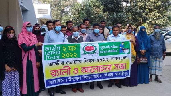 শিবচর (মাদারীপুর) প্রতিনিধিঃ মাদারীপুরের শিবচরে জাতীয় ভোটার দিবস পালিত হয়েছে। বুধবার(২ মার্চ) সকালে উপজেলা চত্বর থেকে একটি র্যালী বের হয়। পরে আলোচনা সভা অনুষ্ঠিত হয়। জাতীয় ভোটার দিবসের এবারের প্রতিপাদ্য বিষয় হলো, ‘মুজিব বর্ষের অঙ্গীকার,রক্ষা করব ভোটাধিকার’। শিবচর উপজেলা নির্বাহী কর্মকর্তা মোঃ আসাদুজ্জামান এর সভাপতিত্বে এ সময় প্রধান অতিথি হিসেবে উপস্থিত ছিলেন উপজেলা পরিষদ চেয়ারম্যান