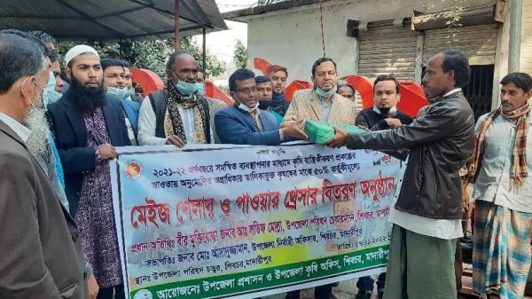 প্রতিনিধি শিবচরঃ মাদারীপুর শিবচরে ২০২১-২২ অর্থবছরে সমন্বিত ব্যবস্থাপনার মাধ্যমে কৃষি যান্ত্রিকীকরণ প্রকল্পের আওতায় ৫০% ভর্তুকি মূল্যে কৃষকদের মাঝে কৃষি যন্ত্রপাতি বিতরণ করা হয়েছে। সোমবার (১৭ জানুয়ারি) দুপুরে উপজেলার পরিষদ চত্তরে ৫০% ভর্তুকির আওতায় বাছাইকৃত উপকারভোগী কৃষকদের মাঝে ৭টি মেইজ শেলার ও ২টি পাওয়ার থ্রেসার দেয়া হয়েছে। মেশিন প্রাপ্ত কৃষকরা হলেন উপজেলার শিবচর ইউনিয়নের আজিজ মাদবর,